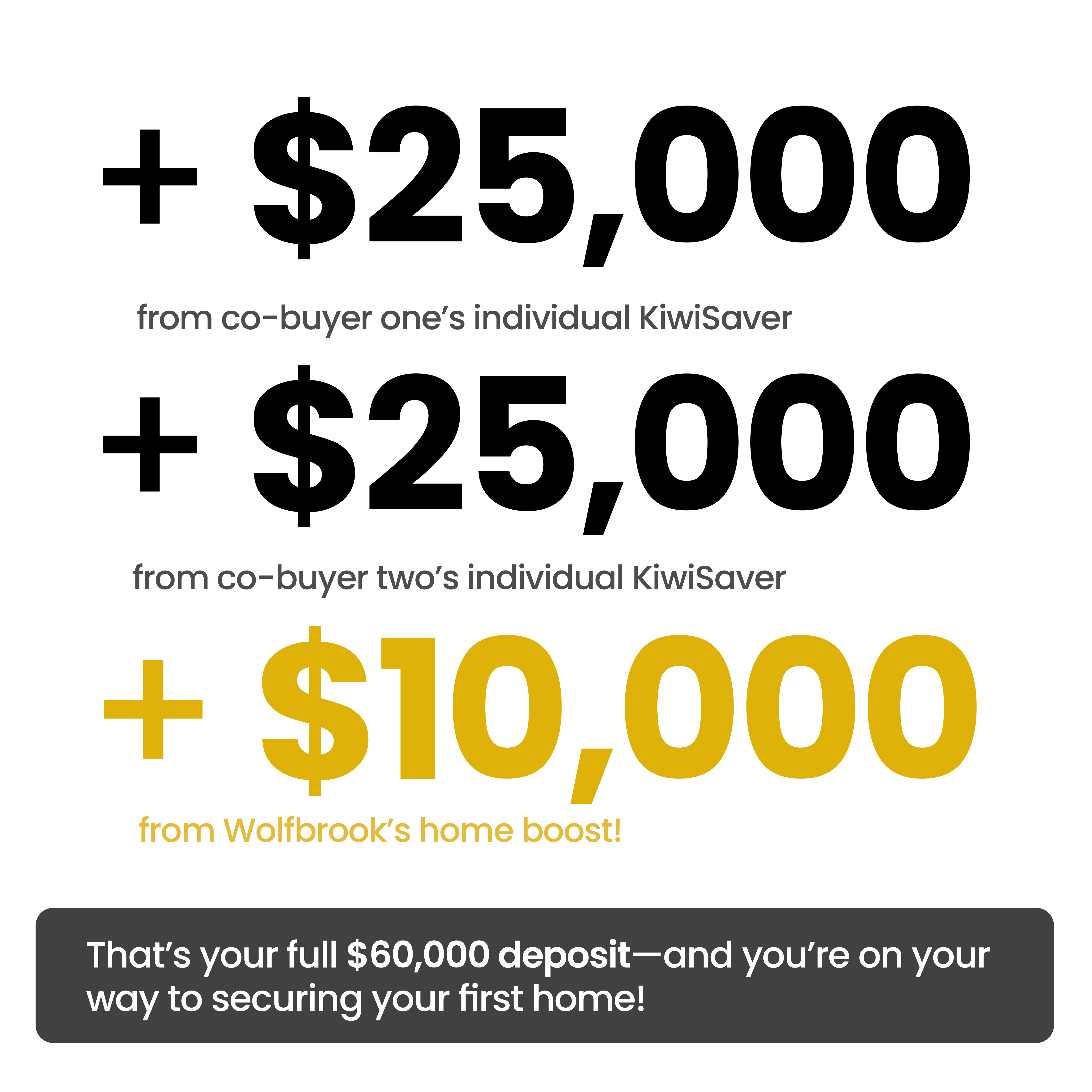 With conjoint KiwiSaver contributions and Wolfbrook’s limited-time home boost, you can take a big step toward homeownership this March.